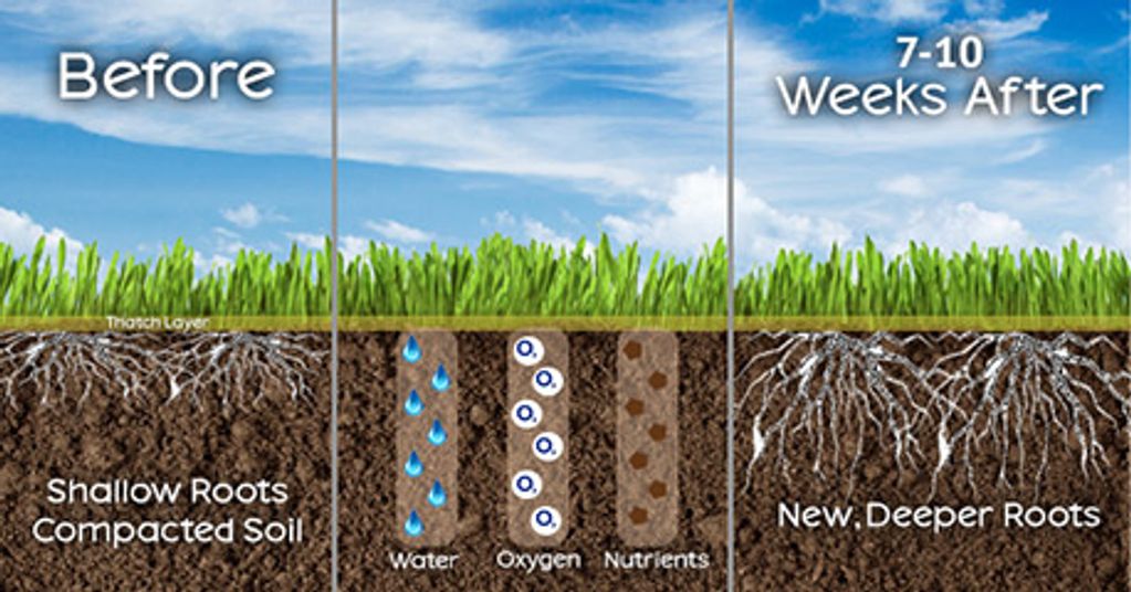 Lawn aeration allows the lawn to breath, reduces soil compaction and allows nutrients, water and oxygen into your lawn. Resulting in a greener more heathly lawn.